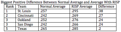 Here are the teams with the biggest positive difference between their normal average and their average with RISP.